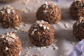 Gaminame: Riešutus ir datules nuplaukite, tuomet kartu su kakavos milteliais apelsino sultimis bei žievele sudėkite į maisto trintuvą ir sutrinkite iki vientisos masės. Gautą masę įdėkite į šaldytuvą ir palaikykite 20 minučių. Praėjus šiam laikui, rankomis formuokite rutuliukus, juos apvoliokite kokosų drožlėse ir skanaukite.