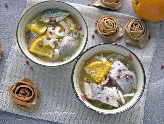 Stiklainyje viską sluoksniuojame taip: silkės gabalėliai, svogūnai, rožiniai pipirai, lauro lapai, garstyčių sėklos ir apelsinų gabalėliai. Užpilame marinatu ir dedame į šaldytuvą mažiausiai parai.