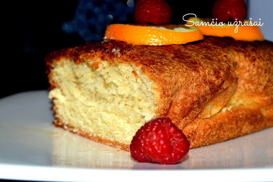 Paruoškite glaistą. Nedideliame dubenėlyje sumaišykite miltelinį cukrų ir šlakelį apelsino sulčių. Aptepkite glaistu iškepusį ir atvėsusį keksą. Papuoškite apelsino griežinėliais.