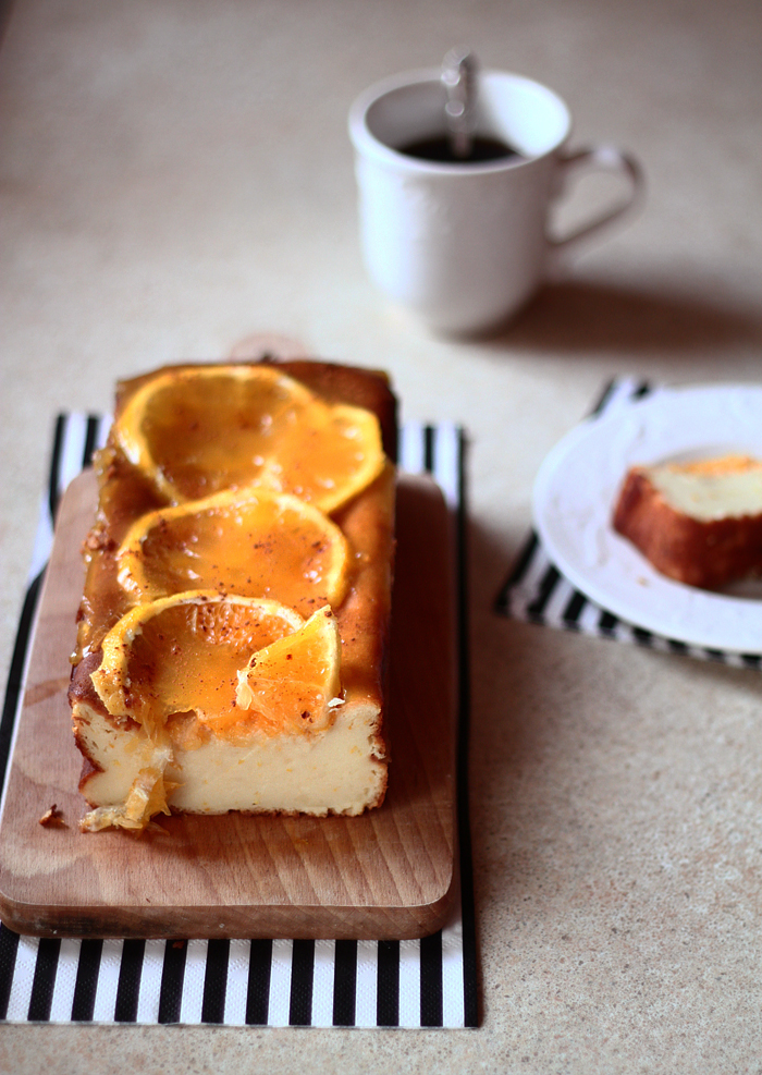 Kepimo indą patepame gabalėliu sviesto ir supilame tešlą. Kepame 180–190 °C temperatūros orkaitėje. Ar iškepė, tikriname įsmeigdami šakutę: jei neaplimpa tešla, vadinasi, iškepęs. Supjaustome kitą apelsino pusę riekelėmis ir išdėliojame ant pyrago. Pyragą apliejame karšta žele (ją ruošiau su apelsinų sultimis), ant viršaus užbarstome cinamono. Paliekame atvėsti, tada dedame į šaldytuvą. Patiekiame šaltą.