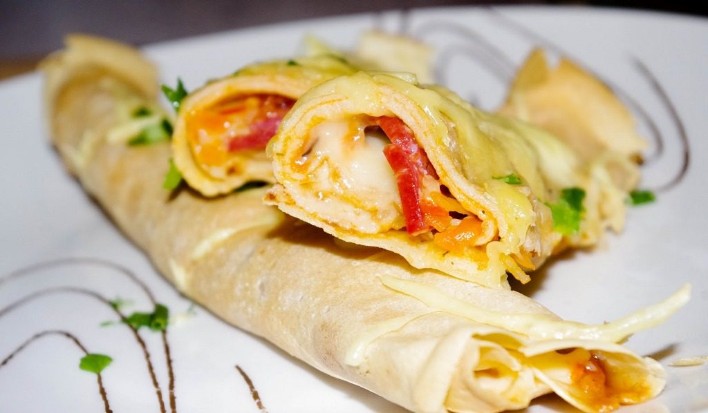 - Blyną ištepkite adžikos padažu, dėkite saliamio griežinėlį, pabarstykite fermentiniu sūriu ir suvyniokite į volelį.