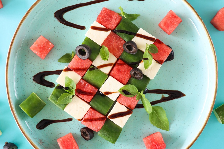 Didelėje lėkštėje konstruokite salotas – pakaitomis dėliokite arbūzo, fetos, agurkų, pomidorų kubelius, pagardinkite druska (nepersistenkite, nes feta turi sūrumo), pipirais. Galite dėlioti didelę „šachmatinę lentą“ arba ingredientus dėti vieną ar kito ir pastatyti kubą. Ant viršaus išdėliokite perpus perpjautų alyvuogių.