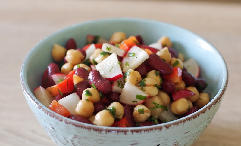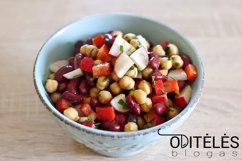 Į dubenį suberkite šaltu vandeniu perplautas ir nusunktas konservuotas daržoves, smulkiais kubeliais supjaustytą papriką, gabalėliais supjaustytus ridikėlius, suberkite petražoles, užpilkite paruoštu padažu, pagardinkite druska ir viską gerai išmaišykite.