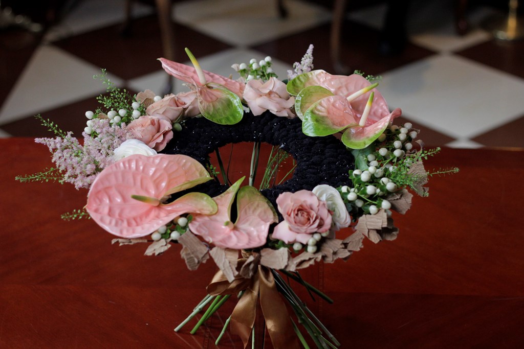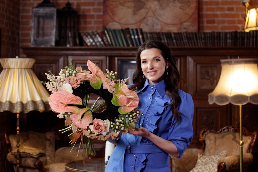 Šįsyk ji sukurs nuostabią anturių puokštę, kurios pagrindu taps karkasas iš kartono, dekoratyvaus popieriaus, floristinės vielutės ir siūlų. Šį karkasą papuoš rausvi anturiai, hiperikų uogytės, grimbelo žaluma, vėdrynai, astilbės ir rožės. Šių rožių žiedus floristikos dizainerė išlankstys – tai itin populiari tendencija, ypač nuotakų puokštėse, leidžianti sukurti įspūdingesnių, didesnių žiedų įspūdį.
