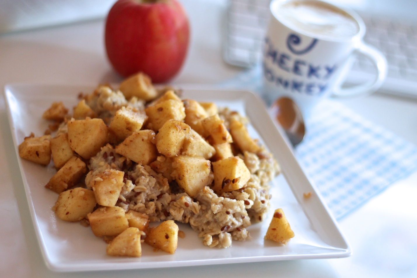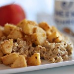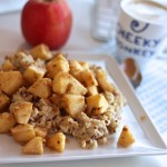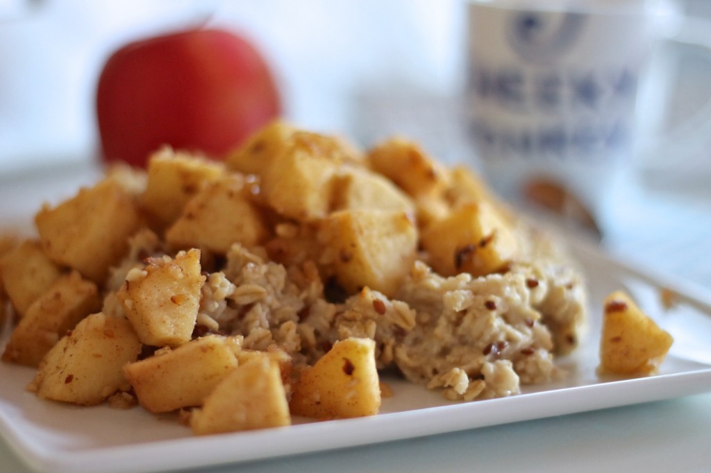 Obuolius nulupame ir supjaustome kubeliais. Apibarstome cukrumi ir cinamonu, apliejame citrinos sultimis. Keptuvėje įkaitiname sviestą arba aliejų ir suberiame obuolių mišinį. Kepame kelias minutes, kol obuoliai ima minkštėti. Įmaišome riešutus ir dar kelias minutes viską pakepiname, kol susidaro norimo minkštumo pagardas. Valgome su šilta koše. Skanaus!