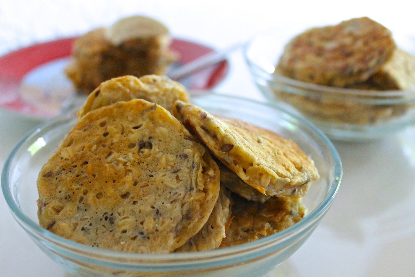 Į avižinių blynų tešlą galima įdėti saulėgrąžų, moliūgo ar kitokių sėklų. Šį kartą naudojamos linų sėmenys. Į tešlą galite įpjaustyti ir džiovintų vaisių arba įberti uogų. Tada nei uogienės, nei grietinės nereikės.