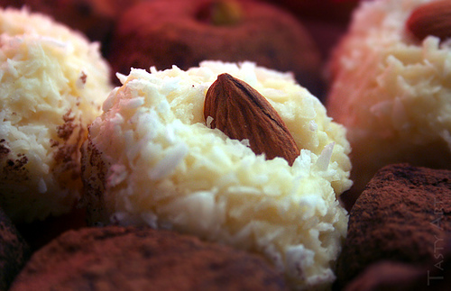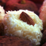 Išimame iš šaldytuvo, rankomis formuojame dailius kamuoliukus. Juos apvoliojame kokoso drožlėse, į vidų įsmeigiame dailų migdolą. Visus paruoštus triufelius dailiai sudedame vieną šalia kito ir pastatome į šaldytuvą. Geriausia jame laikyti per naktį.