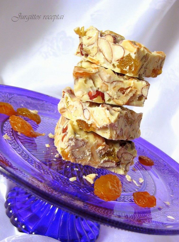 Riešutus pakepiname sausoje keptuvėje ir šiek tiek susmulkiname. Beriame razinas (didesnes galima pjauti per pusę). Šokoladą išlydome, užpilame ant riešutų ir razinų, gerai išmaišome. Dedame masę nestoru sluoksniu į kepimo popieriumi išklotą formą ir statome į šaldytuvą sustingti. Supjaustome kvadratėliais.