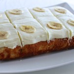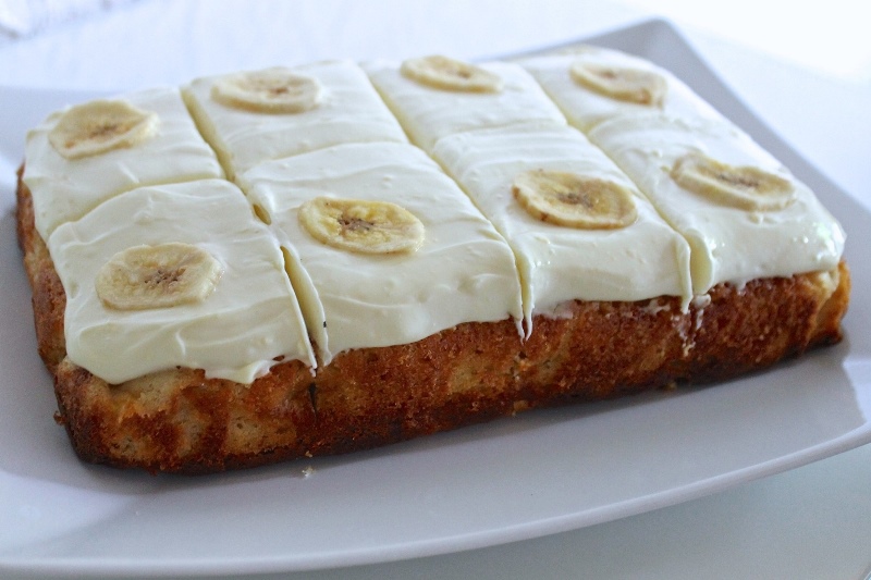 Minkštą sviestą išmaišome su cukrumi ir vanile, dedame po šaukštą sūrio ir išsukame kremą. Aptepame juo atvėsusį pyragą ir kelioms valandoms pastatome į šaldytuvą. Papuošiame džiovintais bananais.