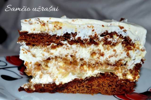 Aš dar sulaisčiau ananasų sultimis, nors recepte ir rašo, kad nereikia, taip pat dėjau sluoksnį konservuotų ananasų.