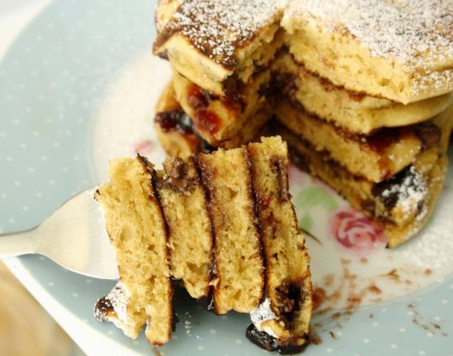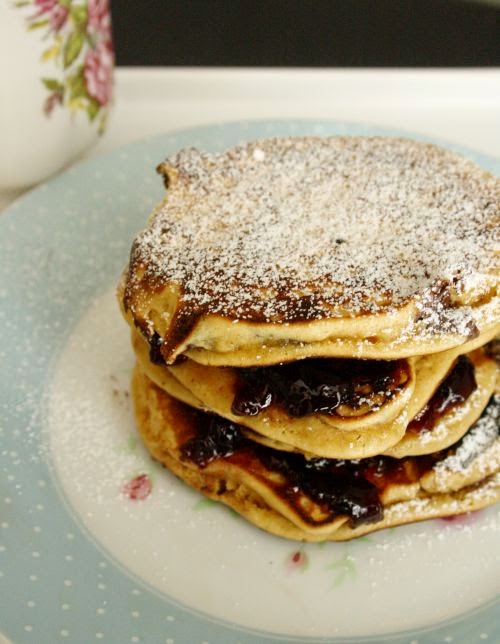 Įkaitintoje keptuvėje dedame po šaukštą tešlos kiekvienam blynui. Šie blynai gana greitai kepa, todėl patarčiau nuolat tikrinti, kada apatinė pusė bus rudos spalvos, ir tada apversti. Patiekiame su uogiene. Skanaus!