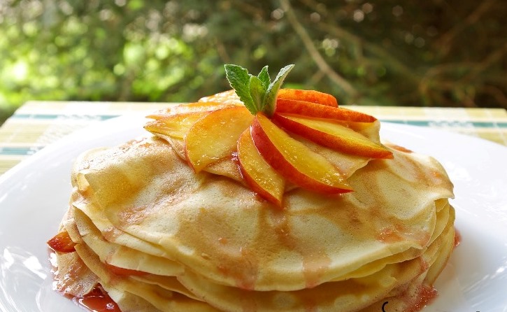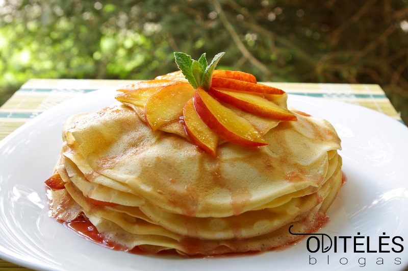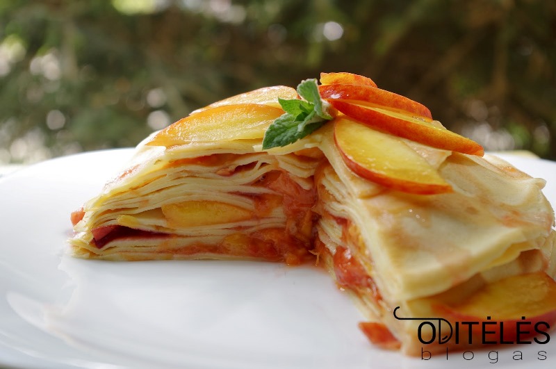 Beliko sukonstruoti tortą: ant kiekvieno blyno dedame po kelias skilteles nektarinų, užpildami susidariusiu padažu.