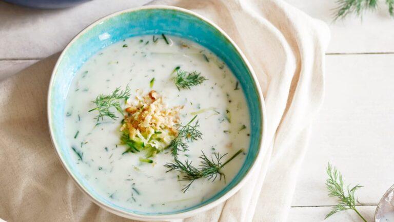 Suberkite smulkintas česnako skilteles, graikinius riešutus, smulkintus krapus, druską ir įpilkite alyvuogių aliejaus. Jeigu norite, kad sriuba būtų skystesnė, įpilkite šlakelį vandens. Agurkų sriubą palikite šaldytuve atvėsti arba įmeskite keletą ledo kubelių.