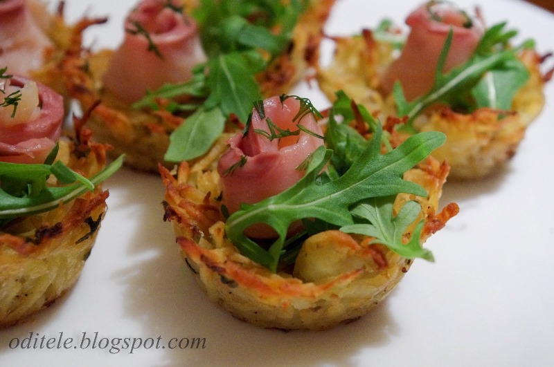 - Keksiukų formą ištepkite sviestu arba aliejumi. Į formelę dėkite po 1 valgomąjį šaukštą bulvių masės ir formuokite lizdelius.