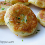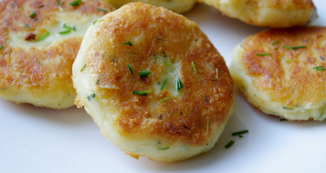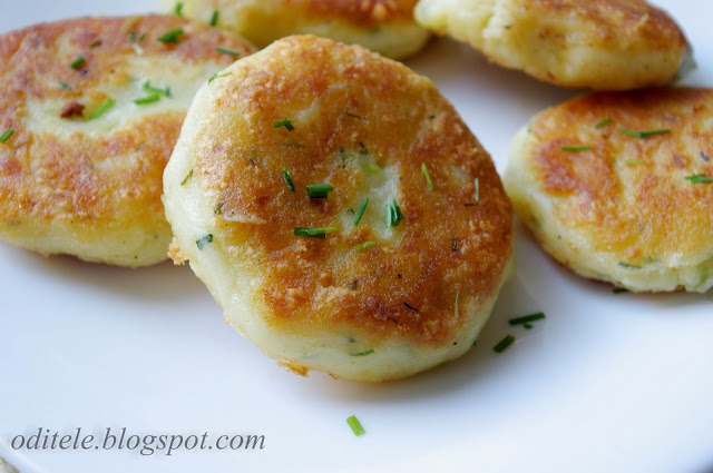 Pastaba. Idealu, jei nuo vakarykščio gaminimo atliko virtų bulvių. Jei bulvių masė bus kiek skystoka, įberkite krakmolo. Darykite mažesnius ir storesnius paplotėlius, nes plonesni ištyžta ir prikepa prie keptuvės.