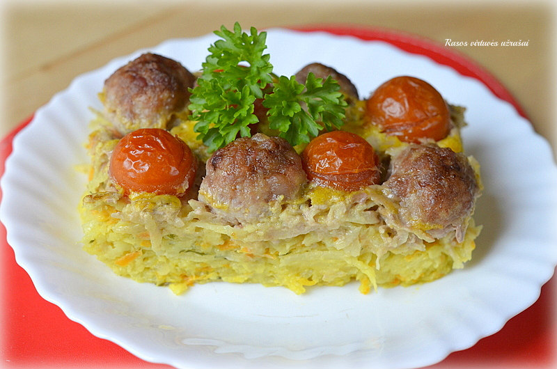 Ant bulvių masės išdėliokite mėsos kukuliukus ir pomidoriukus.