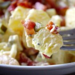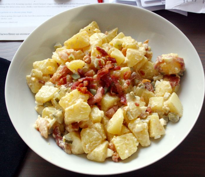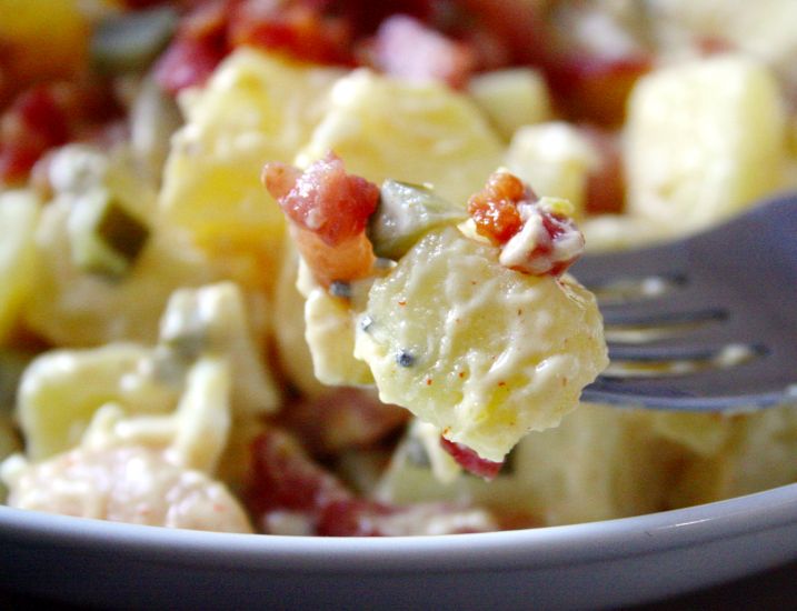 Bulves virti, kol patikrinus šakute jos bus minkštos. Nusunkti. Kol bulvės verda, dideliame dubenyje sumaišyti garstyčias, majonezą ir agurkų skystį. Sudėti virtas bulves į majonezo mišinį.
