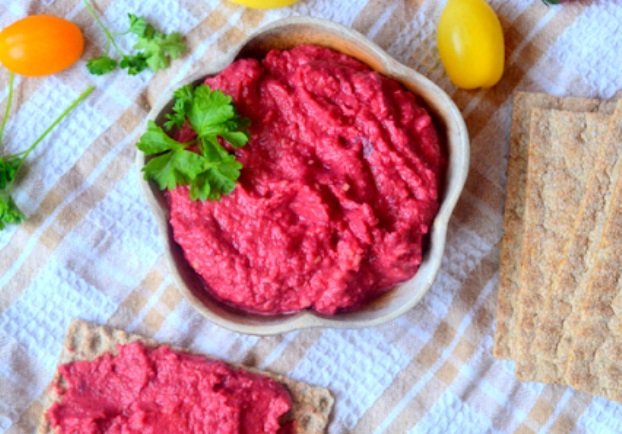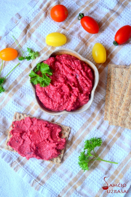 Į trintuvą sudėkite smulkintą burokėlį, avinžirnius ir sutrinkite iki norimos konsistencijos.