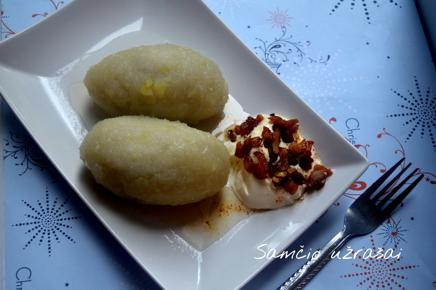 Virtos bulvės sugrūdamos ir sumaišomos su žalių bulvių tarkiais, krakmolu, pasūdoma, gerai išminkoma.