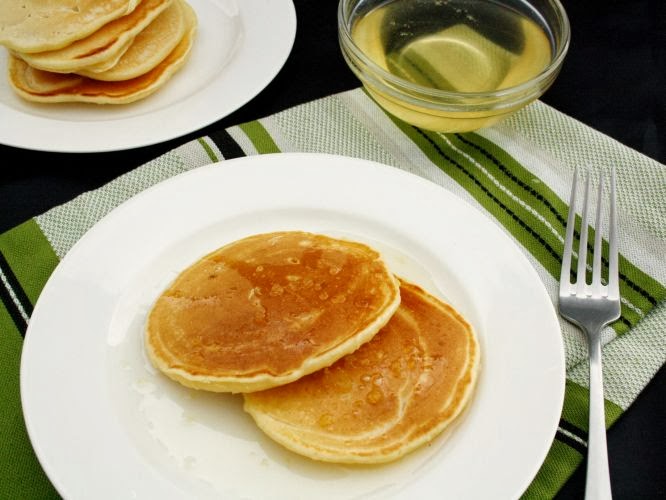 Įkaitiname keptuvę, kiekvienam blynui pilame po maždaug 0,25 stiklinės tešlos. Palaukiame, kol pasirodo burbuliukų, tada blynus apverčiame ir kepame kitą pusę, kol jie įgauna auksinę rusvą spalvą.
