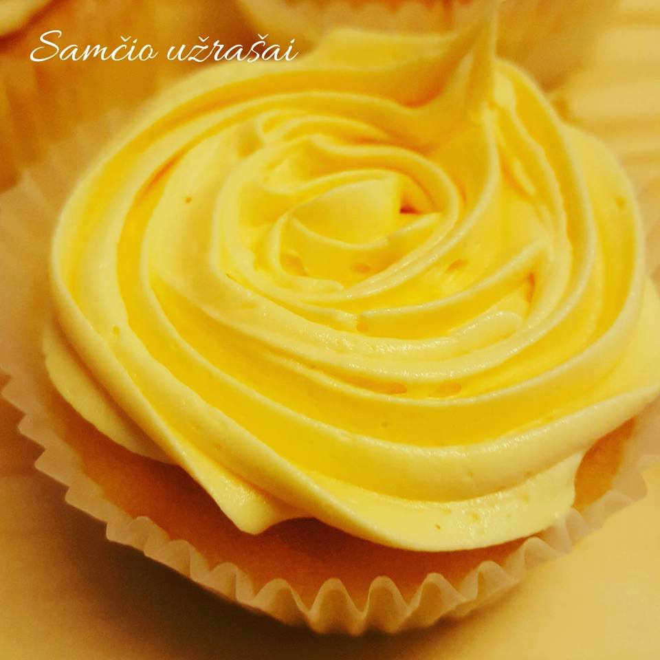 Kremui miltelinį cukrų išmaišykite su minkštu sviestu ir konditeriniu švirkštu išspauskite kremą ant atvėsusių keksiukų.