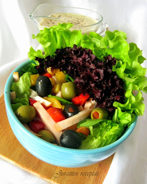 Kumpį ir paprikas supjaustome juostelėmis. Sumaišome su kitais produktais. Dedame mišrainę į dubenį su salotų lapais ir atskirai patiekiame užpilą. Skanaus!