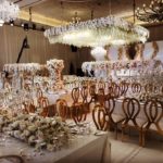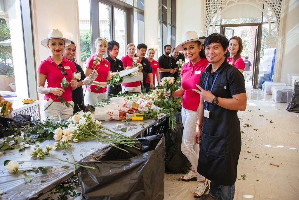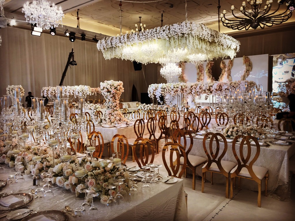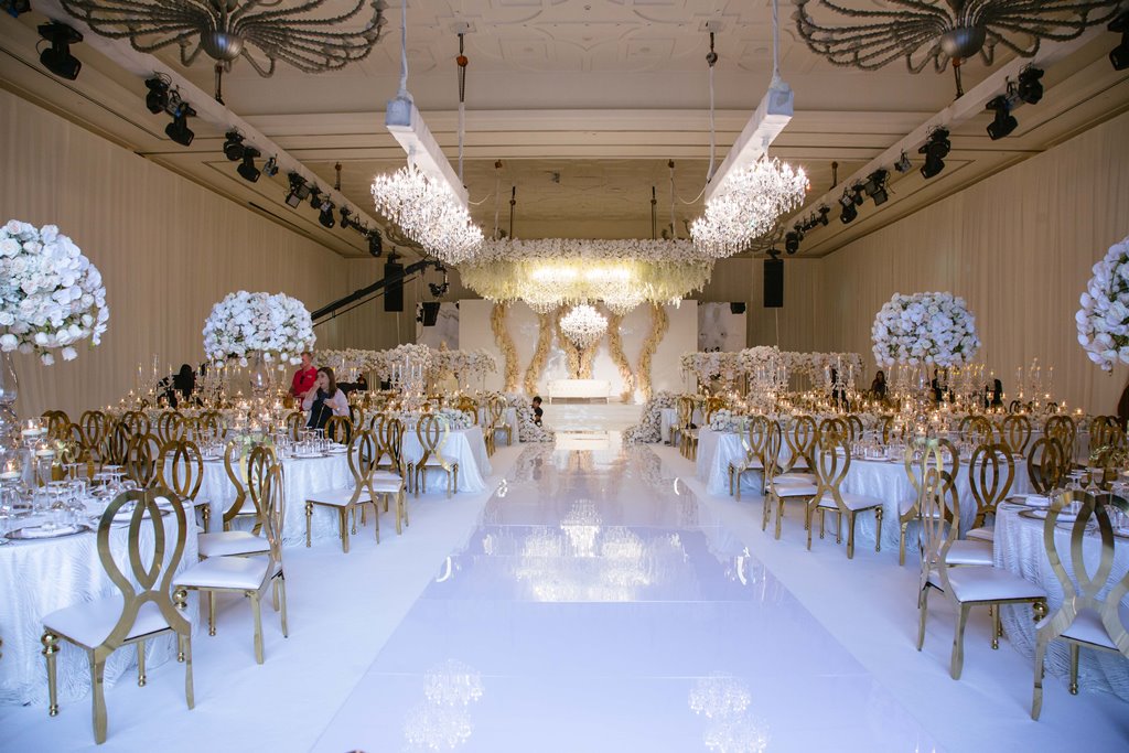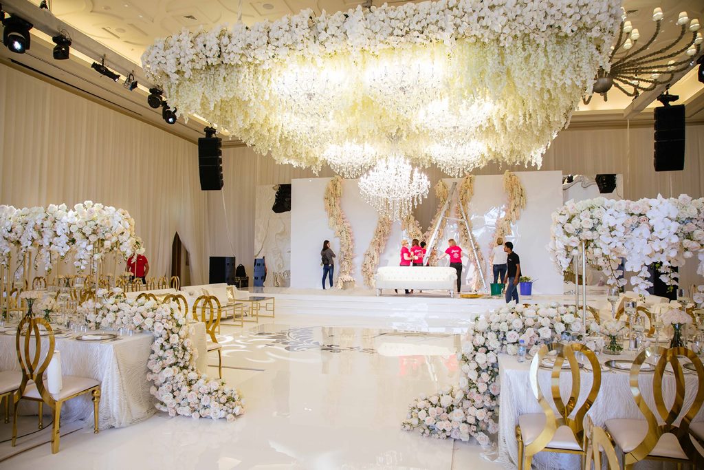 Aktyviausias pasirengimas vestuvėms, kuriose dalyvavo apie 250 svečių, vyko pusantros paros. Vienu metu viešbučio erdvėse darbavosi apie 70 žmonių – techniniai darbuotojai, floristai, dekoratoriai. Pagrindinės šventės salės sienos buvo uždengtos pieno baltumo audiniais, o į palubę kilo krištolo sietynai ir gėlių kompozicijos. Ir gyvais, ir dirbtiniais žiedais puoštos sienos, stalai, arka lauke, kur vyko tuoktuvių ceremonija. Iš viso aplinką išdabino apie 70 tūkst. augalų.