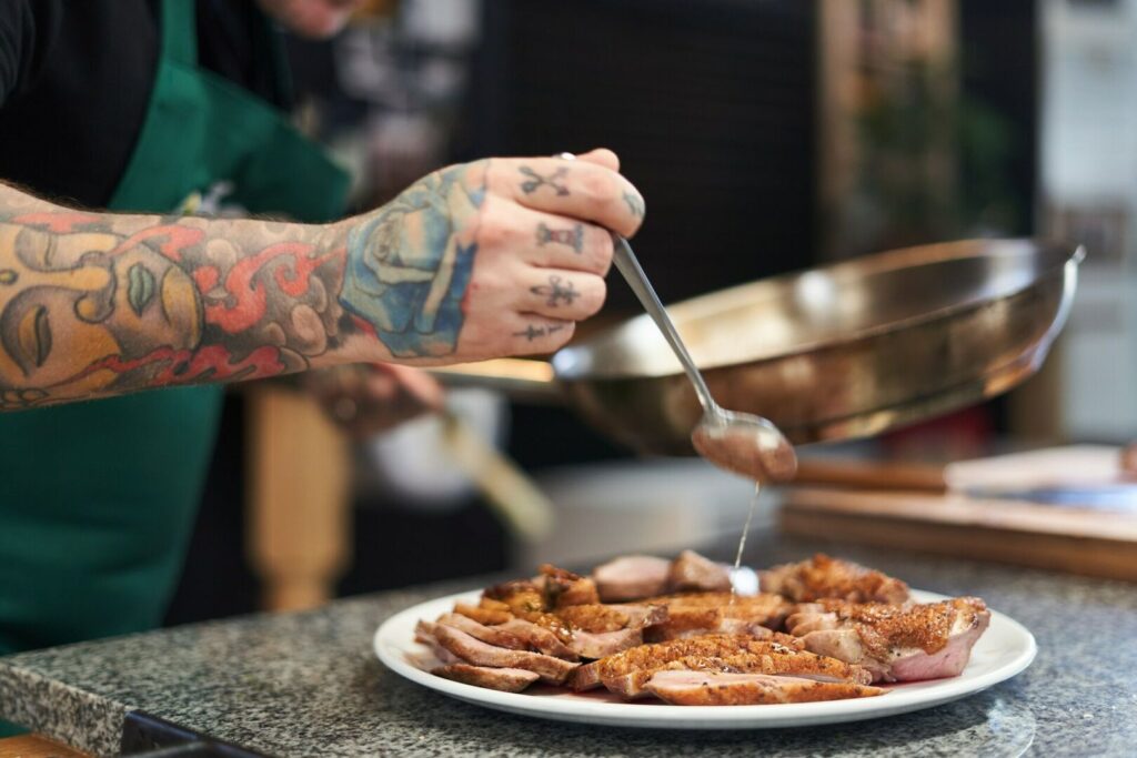 - Išėmę antį, palikite ją pailsėti 8 minutes – tai labai svarbu, kad sultys nenubėgtų ir mėsa išliktų minkšta. Pailsėjusią krūtinėlę supjaustykite riekelėmis ir užpilkite iš keptuvės likusiu sviesto bei antienos sulčių padažu.