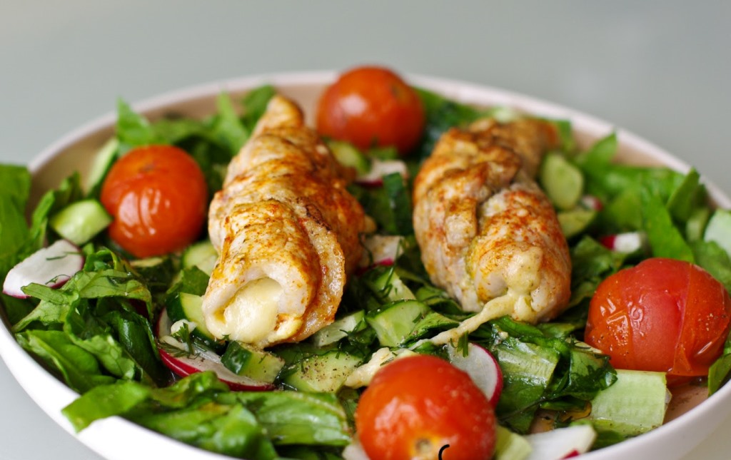 Imkite kepsnelį ir vieną pusę patepkite pesto padažu, tolygiai paskirstykite. Uždėkite riekelę sūrio, susukite ir sutvirtinkite mediniu iešmeliu. Paruoškite 6 suktinukus su pesto padažu, o kitus 6 – su Dižono garstyčiomis.