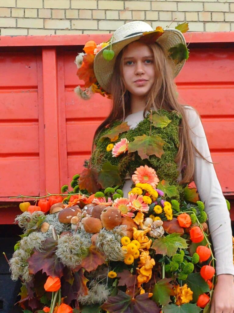 – ir karūnos bei kiti galvos papuošalai, komponuoti iš daugybės įvairiausių gėlių žiedų.