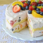 Visiškai sustingusį tortą išimkite iš torto formos, nuimkite kepimo popierių ir dėkite į didelę lėkštę ar tortinę. Viršų papuoškite uogomis ir vaisiais pagal fantaziją.