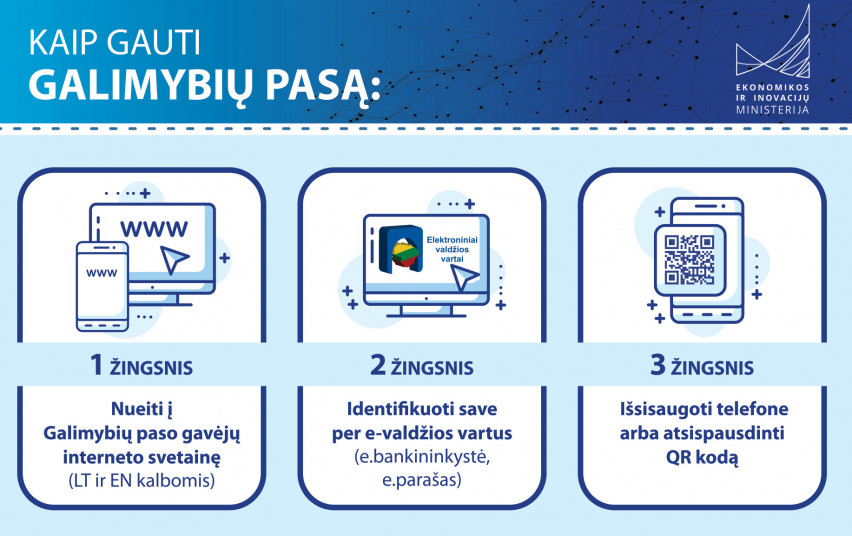 Norint gauti galimybių pasą, interneto puslapyje reikės per elektroninius valdžios vartus suvesti asmens autentifikavimo duomenis ir išsisaugoti suteiktą QR kodą telefone ar kompiuteryje. Jokių papildomų išrašų įrodymų nereikės – šis kodas, kuris ir yra Galimybių pasas, bus išmaniajame įrenginyje, jį taip pat bus galima išsisaugoti pdf formatu ar atsispausdinti.