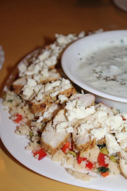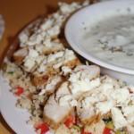 Lėkštės viduryje, praskirstę kruopainius, dedame paruoštą padažą. Kruopainius apšlakstome alyvuogių aliejumi, apibarstome fetos sūriu, apdėliojame vištiena. Skanaus!
