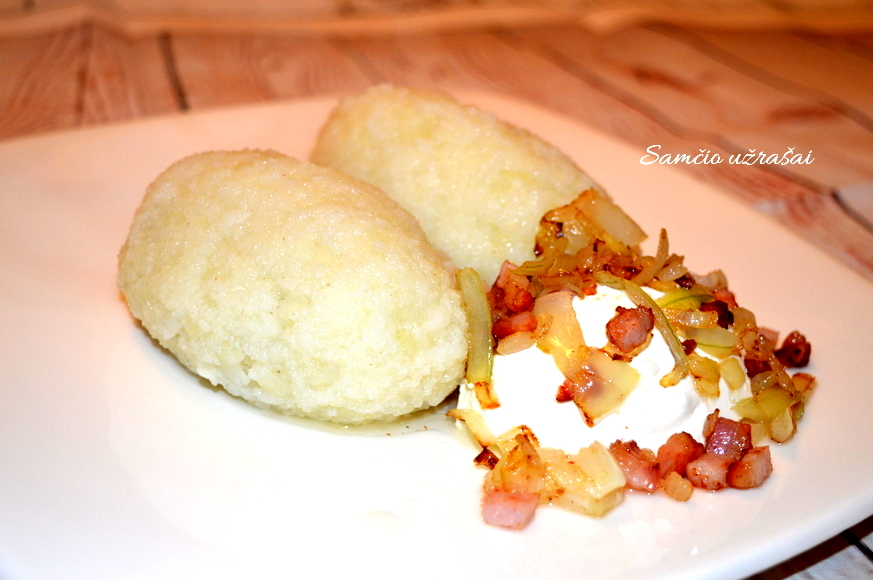 Į bulvių masę beriame manų kruopas, bulvių krakmolą ir druską. Viską gerai išminkome.