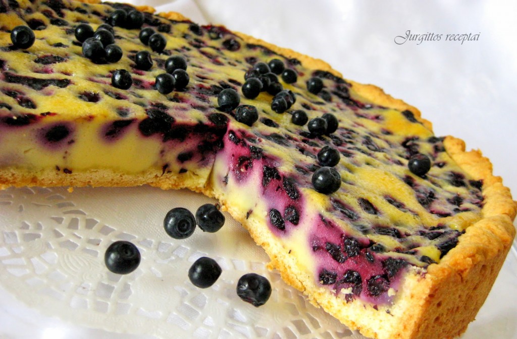 Surinkimas. Ant formos dugno ir sienelių (apie 4 cm) rankomis paskirstome tešlą. Suberiame ant jos mėlynes ir pilame grietininį užpilą. Kepame iki 180 °C įkaitintoje orkaitėje 45 min. Iškepusį pyragą palaikome orkaitėje, kol šiek tiek atvėsta. Tada visiškai atvėsiname (geriausia palaikyti per naktį šaldytuve). Skanaus!