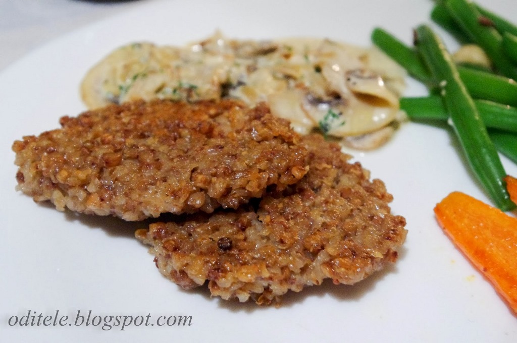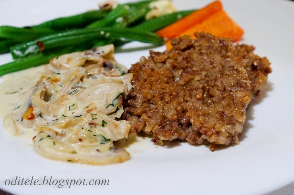 Padažui svogūną supjaustykite kubeliais ir apkepkite aliejuje. Tada sudėkite griežinėliais pjaustytus pievagrybius. Jiems apkepus, pilkite grietinėlę ir kaitinkite, kol sutirštės. Pagardinkite druska ir juodaisiais pipirais bei šviežiais krapais.