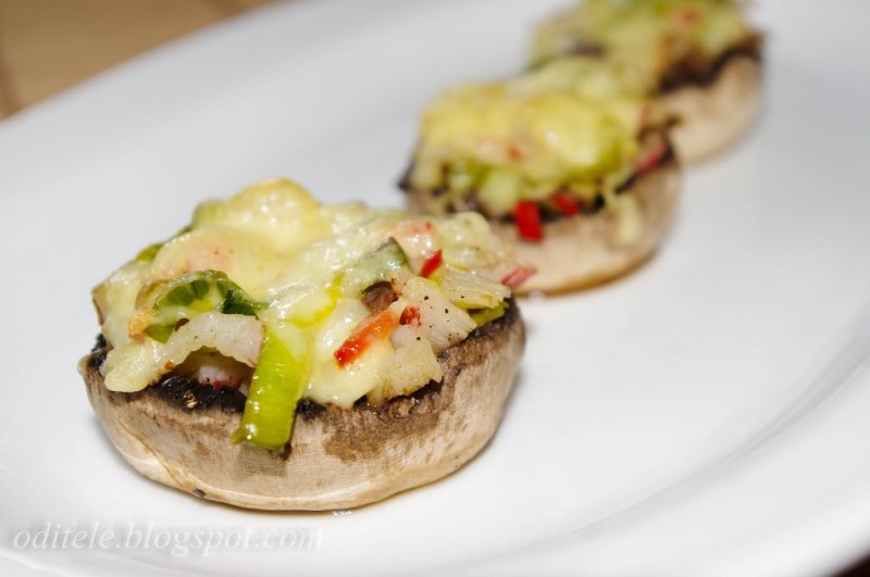 - Šaukšteliu ant pievagrybių galvučių uždėkite įdaro ir užberkite tarkuoto fermentinio sūrio.