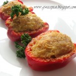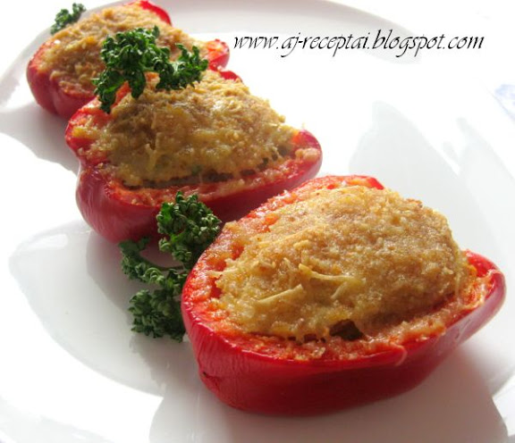 Paprikas perpjauname pusiau, išskobiame sėklalizdžius. Svogūną smulkiai supjaustome ir apkepiname (nors tai nėra būtina, galima į mėsą jį dėti ir žalią), dedame į faršą. Taip pat sudedame smulkintus žalumynus, beriame druskos, pipirų, prieskonių. Prikemšame paprikų puseles faršo. Ant viršaus pabarstome tarkuoto sūrio, ant sūrio – džiūvėsėlių ir galiausiai ant kiekvienos puselės uždedame po gabaliuką sviesto. Kepame iki 190 °C įkaitintoje orkaitėje apie 40 min. Patiekiame su bulvėmis arba ryžiais. Skanaus!
