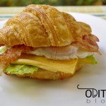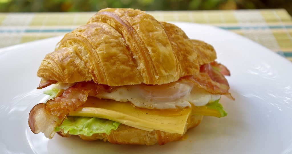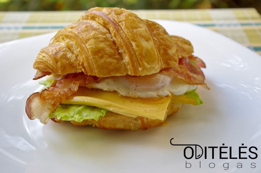 Tada ant vienos ragelio pusės uždėkite salotų lapų, čederio griežinėlį, skystai iškeptą kiaušinį (jį pagardinkite druska, maltais juodaisiais pipirais), ant viršaus uždėkite po dvi šoninės juosteles, uždenkite kita ragelio pusele.