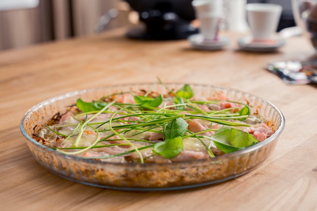 Bulves nuskusti ir sutarkuoti burokine trintuve. Tarkius sumaišyti su kiaušiniu, grietinėle ir bulvių prieskoniais. Įberti druskos ir pipirų pagal skonį. Plačią kepimo formą ištepti sviestu ir dugną bei sieneles padengti džiūvėsėliais. Sudėti tarkius ir paspaudžiant išlyginti. Kepti iki 180 °C įkaitintoje orkaitėje apie 35 minutes. Ant iškepusio pagrindo išdėlioti kumpį, paplėšytą sūrį, pabarstyti tarkuotu parmezanu. Vėl pašauti į orkaitę ir kepti apie 10 minučių, kol išsilydys sūris. Patiekti pabarstytą turimais žalumynais. Skanaus! |