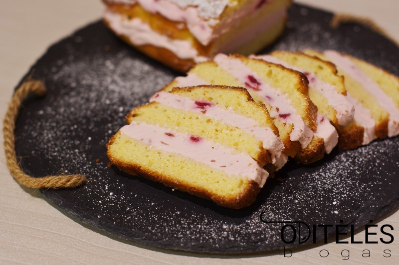 Į kekso formą dėkite kekso lakštą ir pusę kremo, tada ant viršaus dėkite vėl lakštą ir likusią dalį kremo, uždenkite likusiu lakštu. Dėkite į šaldytuvą ir jame laikykite kelias valandas arba per naktį.