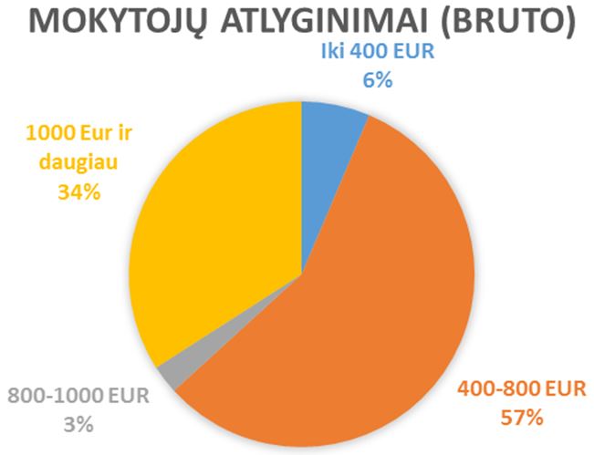 Statistika rodo, kad 57 proc. pedagogų uždirba nuo 400 iki 800 eurų, neatskaičius mokesčių. Trečdalio pedagogų alga perkopia 1000 Eur iki mokesčių. Tiek gali uždirbti tik mokytojas, turintis kiek didesnį nei vidutinį pamokų skaičių – 24 pamokas – ir dirbantis mokykloje keliolika metų bei pasiekęs aukštesnę kvalifikacinę kategoriją (metodininko).