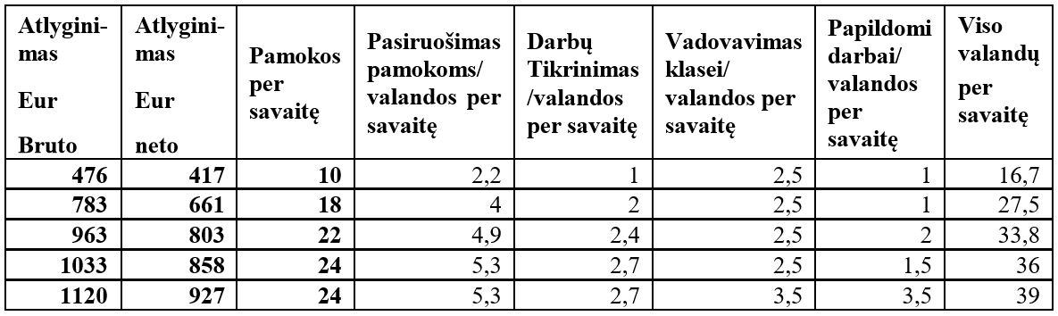 IŠ KO SUSIDEDA MOKYTOJO ATLYGINIMAS. Lentelėje (joje kalba netaisyta – red. past.) pateikiame skaičiavimo pavyzdį, pritaikytą 15 darbo metų stažą ir mokytojo metodininko kategoriją turinčiam pedagogui. Valandos papildomiems darbams, vadovavimui klasei gali šiek tiek kisti.