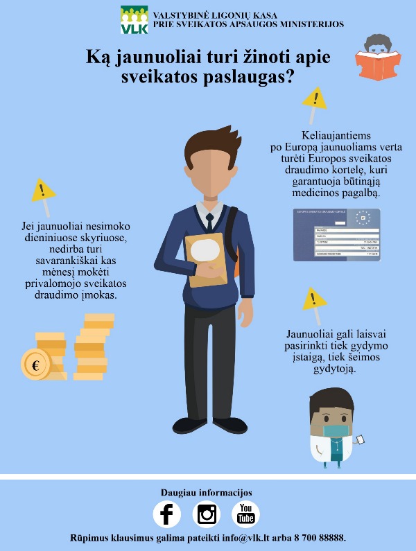 Kad moksleiviams ir studentams būtų lengviau orientuotis privalomojo sveikatos draudimo (PSD) sistemoje, Valstybinė ligonių kasa prie Sveikatos apsaugos ministerijos (VLK) primena keletą svarbių dalykų, kuriuos privalu žinoti kiekvienam jaunuoliui.