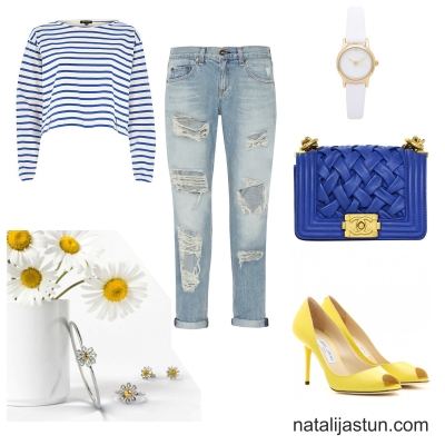 1. Dryžuotus petinius drabužius galite drąsiai dėvėti su džinsiniais drabužiais. Tokius komplektus pagyvinkite ryškios spalvos aksesuarais.