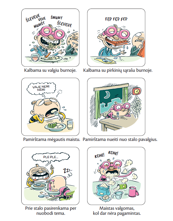 Ši istorija yra tik vienas gerų (ir nelabai gerų) manierų pavyzdys. Jos susiformuoja palengva, darant klaidas ir iš jų mokantis. Jos reikalingos ir susiruošus sėsti prie stalo. Ar pastebėjote, kaip prie stalo elgiasi jūsų vaikai? Ar jie drabsto maistą kairėn ir dešinėn? Ar sako „prašau paduoti“, ar viską išvarto norėdami ką nors pasiekti?