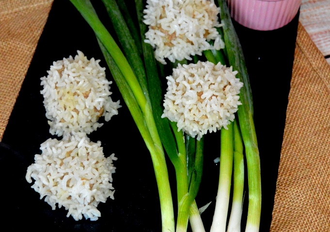 Ryžius supilame į didelę lėkštę. Iš mėsos formuojame dviejų kąsnių kukuliukus, apvoliojame ryžiuose. Nespauskime, nes ryžiai patys gražiai prilips. Dedame kukuliukus į garų puodą, palikdami tarpelius tarp jų, ir gariname 25 min. Iki garinimo pabaigos likus kelioms minutėms nukeliame dangtį ir pagariname dar be dangčio, taip ryžiai geriau prisitvirtins prie kukulio ir nenubyrės.