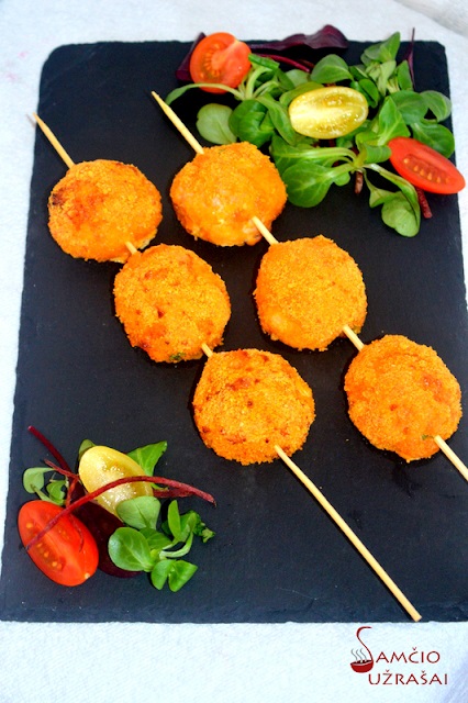 Padarykite iš faršo golfo kamuoliuko dydžio kukuliukus ir apvoliokite džiūvėsėliuose.