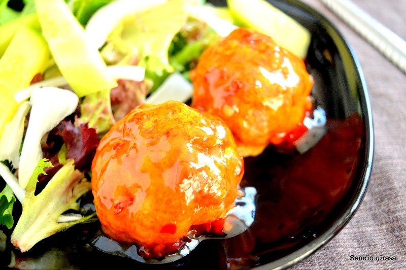 Dviem šaukštais imkite kukulius ir apvelkite padažu.