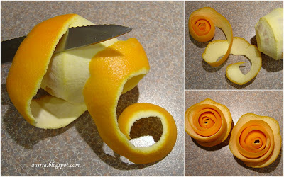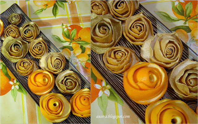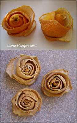 Galima žaisti ir su citrusinių vaisių žievėmis. Tiesiog peiliu lupant apelsino žievę, reikia sukti ratu (spirale) ir raityti roželę. Ją reikia palikti šiltai (pvz., ant radiatoriaus), kad nepradėtų pelyti ir išdžiūtų (prismaigstytus apelsinus galima greičiau išdžiovinti taip pat padėjus juos ant radiatoriaus ar šildomų grindų). Iš apelsino išeis didesni, iš mandarino – mažesni žiedeliai. Iš didesnio greipfruto žievės galima susukti stambų žiedą.